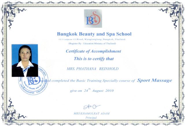 CERTIFICATE Beauty and Spa School Bangkok Beauty and Spa School 12/1 Ladpraw 122 Road, Wangtonglang, Bangkok, Thailand (Register By: Education Ministry of Thailand)