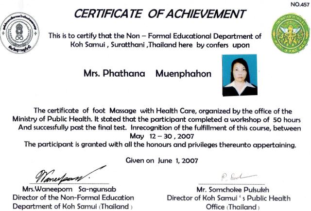 CERTIFICATE OF ACHIEVEMENT The certficate of foot Massage with Health Care, organized by the office of the Ministry of Public Health. It stated that the participant completed a workshop of 50 hours...
